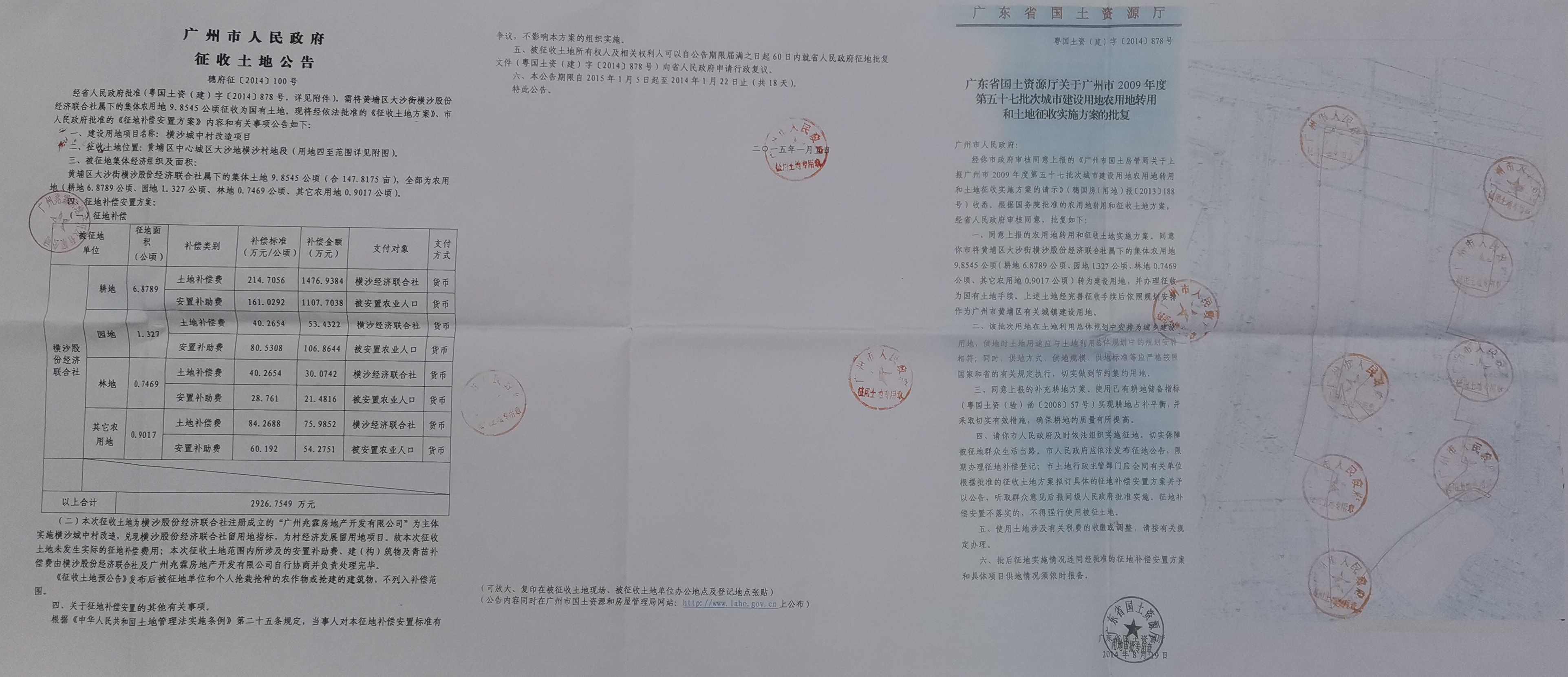 经省人民政府批准(粤国土资(建)字〔2014〕878号,详见附件),需将黄埔区大沙街横沙股份经济联合社属下的集体农用地9.8545公顷征收为国有土地。现将经依法批准的《征收土地方案》、市人民政府批准的《征地补偿安置方案》内容和有关事项公告如下: