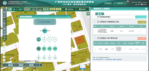 为提升数据精度,夯实基础数据质量,探索“一村一核实”的实施路径。选取南沙区甘岗村、湴眉村试点开展集体经济组织成员数据核实,通过多次下沉试点村,与村委面对面探讨数据核实规则和方法,形成了“技术+人工”双驱的核数路径一是在“人户房地”一体化管理系统研发“智能数据核实”模块,实现智能比对农村户籍、股东数据,一键自动组户;研发家庭图谱配置工具,自动识别并关联家庭成员,支持在线编辑与修正,并通过可视化图谱清晰展示家庭关系。提高了数据核实效率,试点经验可在全市推广使用。二是充分发挥村委“人熟、地熟、情况熟”的优势,在系统自动配置的基础上加以村干部人工校验,确保数据准确度。目前已完成了试点村近1100余户家庭关系图谱的核实,明确了4000余个集体经济组织成员与宅基地、房屋的关联关系,使“人户一本账”更加清晰完整,数据使用更有底气。