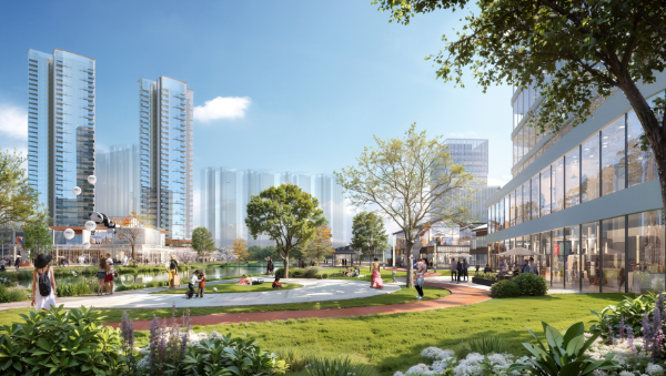 规划设计方案秉持生态优先、景观融合、立体营城的原则,以精细化规划设计实现城市轨道交通基础设施多元价值。通过“理水”“贯绿”的设计手法衔接区域河涌水系,营造滨水、亲水界面,塑造贯通南北的绿色开敞空间,形成水绿相间的生态廊道,实现500米见园,300米见绿。利用地铁轨道设施上盖空间打造景观化的中轴公园,形成片区活力目的地。依托嘉禾望岗TOD枢纽进行紧凑开发,以“便捷1公里”为理念打造“快线慢网”交通网络。结合车辆段上盖开发,平面上通过用地布局整合,立体上通过设施、建筑、景观一体化设计,实现轨交设施盖上盖下一体化衔接,并整合轨交设施“金角银边”用地创造积极的城市公共空间。