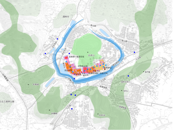 莲塘村“背靠玄武、玉带揽腰”村落格局示意图