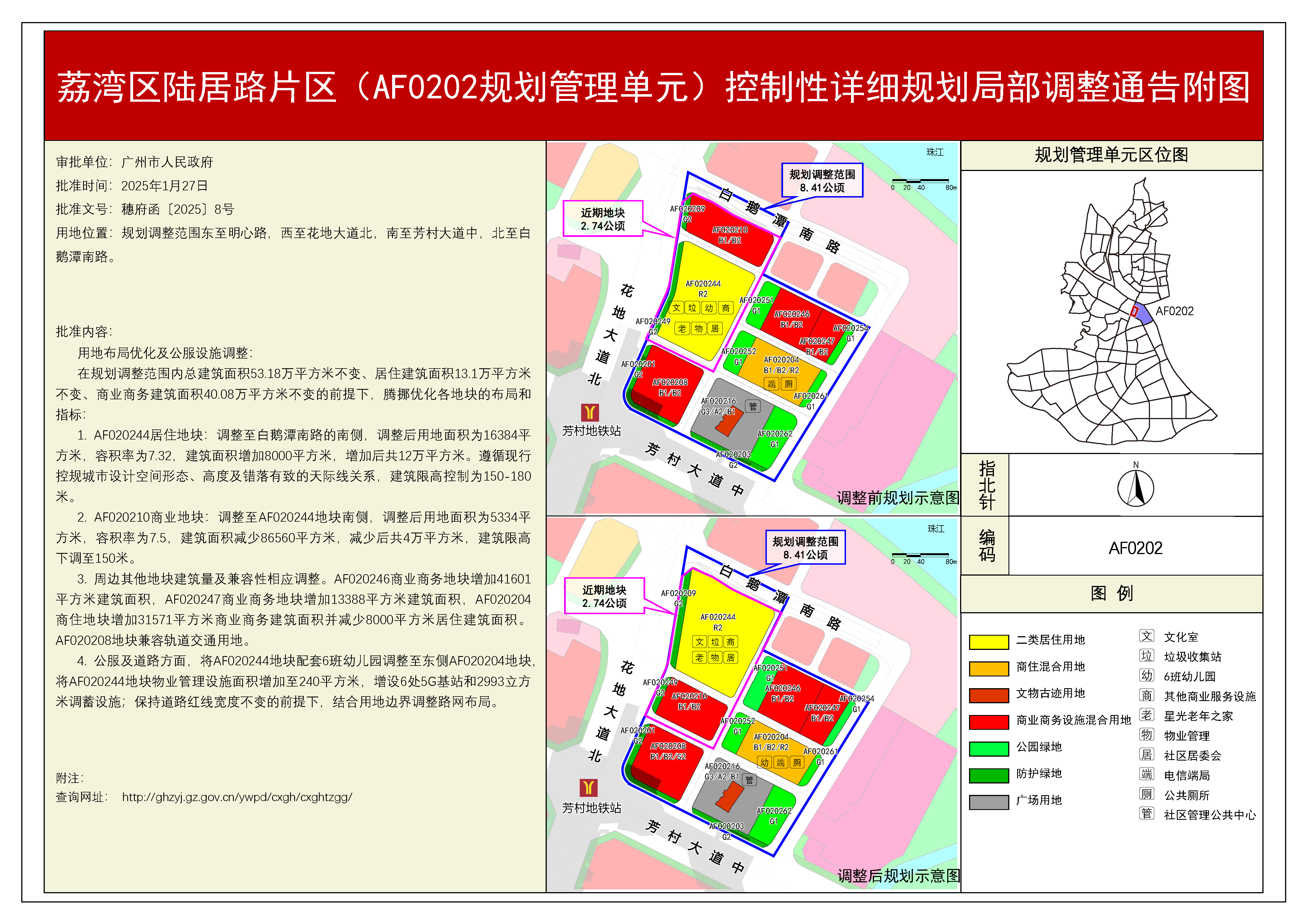 根据《广东省城市控制性详细规划管理条例》,《荔湾区陆居路片区(AF0202规划管理单元)控制性详细规划局部调整》规划成果已完成编制、审查、公示等程序,由广州市规划委员会审议通过后经广州市人民政府批准(穗府函〔2025〕8号),自批准之日(2025年1月27日)起生效。