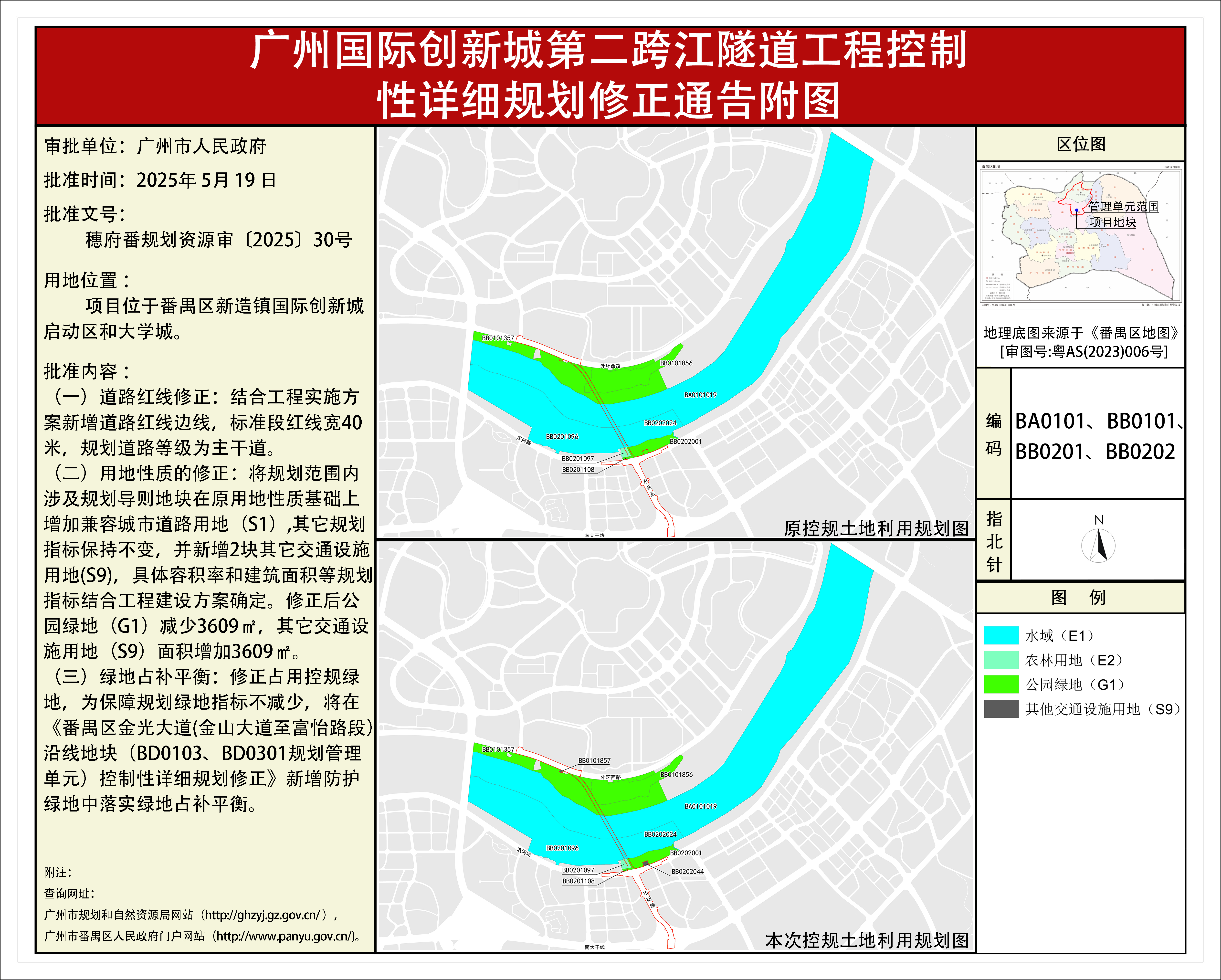 根据《广东省城市控制性详细规划管理条例》、《广州市人民政府关于将一批市级行政职权事项继续委托区实施的决定》(穗府[2019]8号),《广州国际创新城第二跨江隧道工程控制性详细规划修正》规划成果已完成规划技术审查、批前公示等程序,并经番禺区土地和规划领导小组会议审议通过后获广州市人民政府批准,自批准之日(2025年5月19日)起生效。