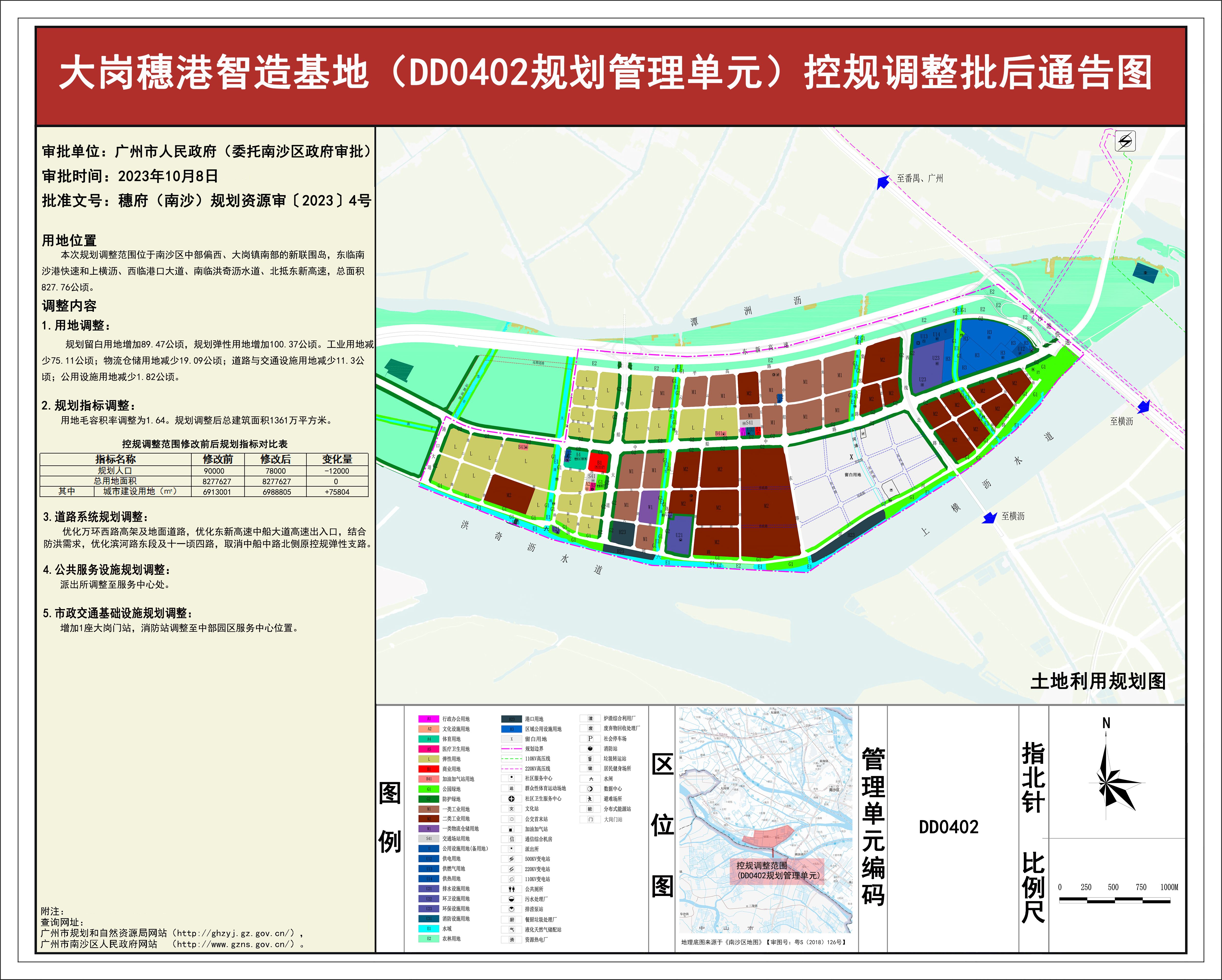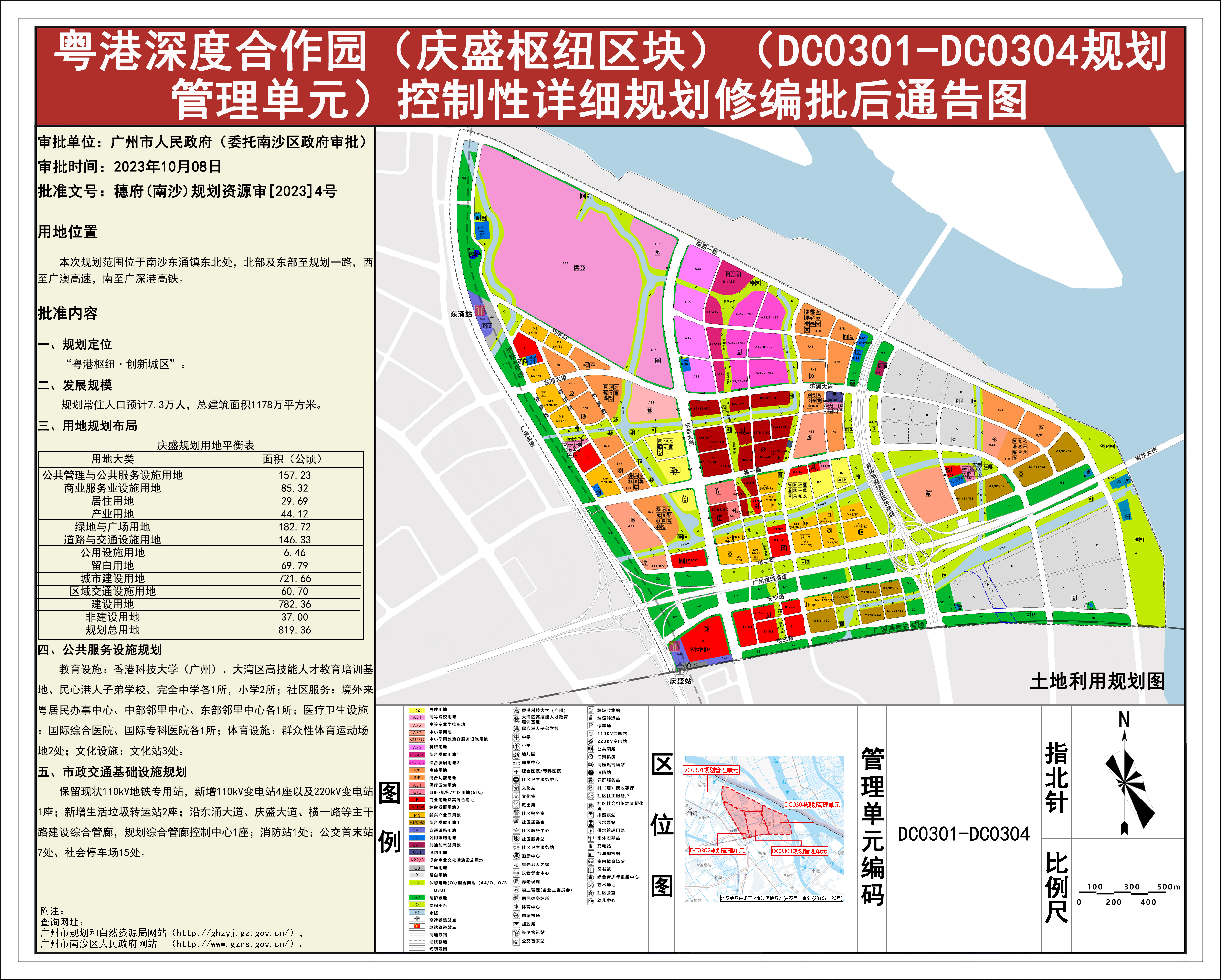 根据《广东省城市控制性详细规划管理条例》《广州南沙新区控制性详细规划制定办法》有关规定,《粤港深度合作园(庆盛枢纽区块)(DC0301-DC0304规划管理单元)控制性详细规划修编》、《大岗穗港智造基地(DD0402规划管理单元)控规调整》已完成规划技术审查、批前公示等程序,并经广州市南沙新区自然资源规划与利用委员会审议通过后获广州市南沙区人民政府(受广州市人民政府委托)批准(穗府(南沙)规划资源审〔2023〕4号),自批准之日(2023年10月8日)起生效。