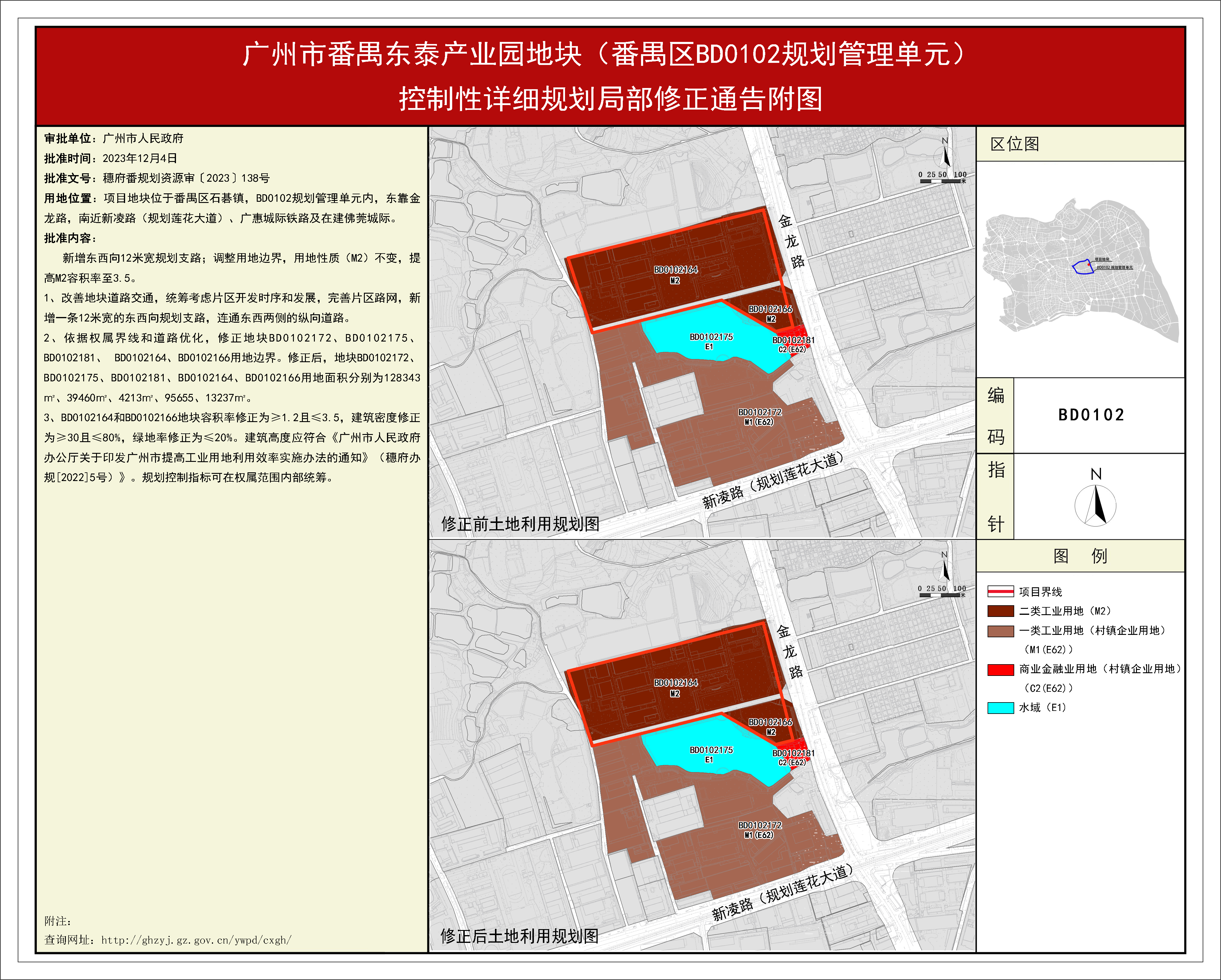 根据《广东省城市控制性详细规划管理条例》、《广州市人民政府关于将一批市级行政职权事项继续委托区实施的决定》(穗府[2019]8号)、《广州市人民政府关于收回一批市级行政权力事项的决定》(广州市人民政府令第188号),《广州市番禺东泰产业园地块(番禺区BD0102规划管理单元)控制性详细规划局部修正》规划成果已完成规划技术审查、批前公示等程序,并经番禺区土地和规划领导小组会议审议通过后获广州市人民政府批准,自批准之日(2023年12月4日)起生效。