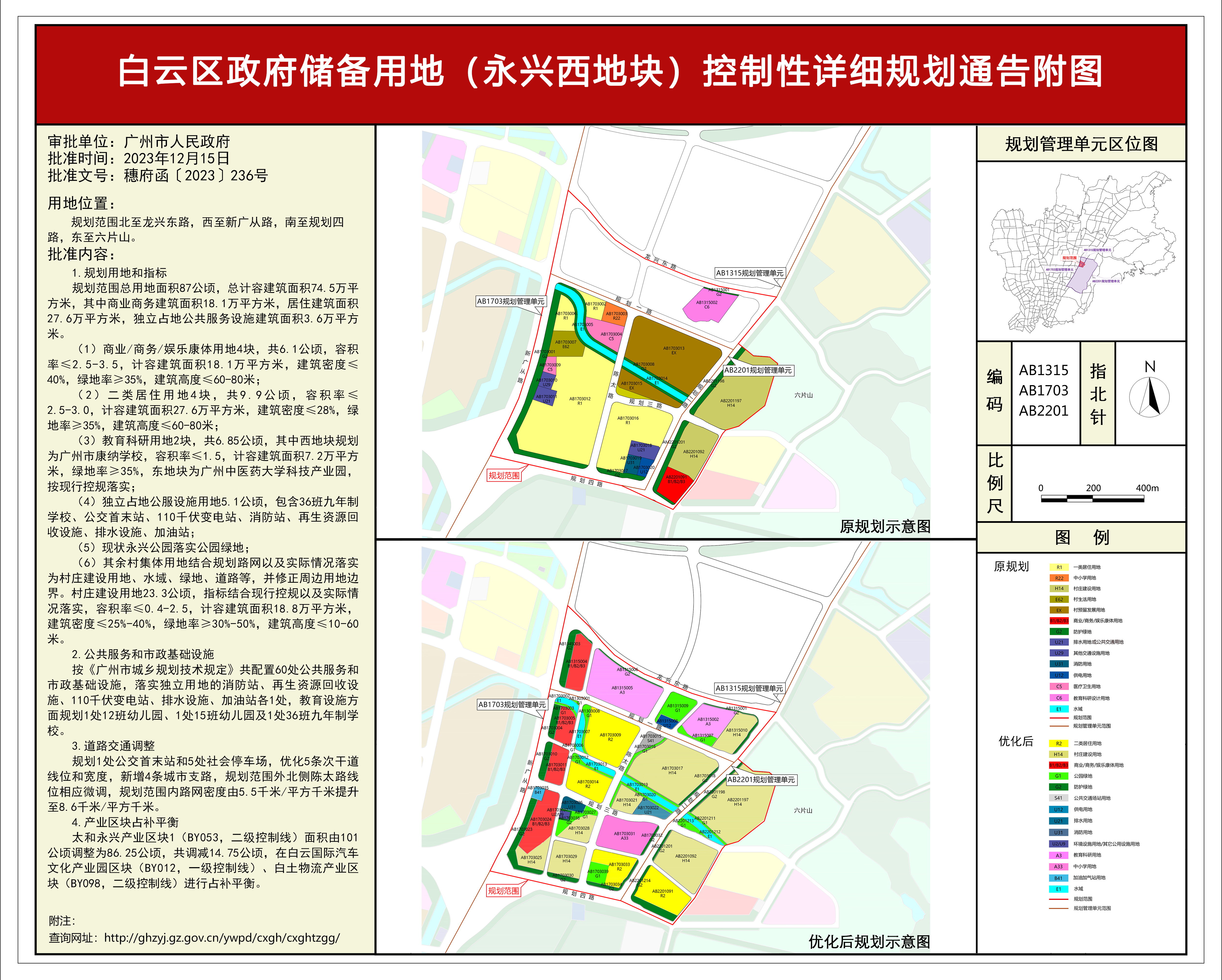 根据《广东省城市控制性详细规划管理条例》,《海珠区琶洲西区AH040311地块(AH0403规划管理单元)控制性详细规划》《天河区广物控股集团历史用地吉山仓地块(AT1010规划管理单元)控制性详细规划》《天河区执信三路地块(AT1005规划管理单元)控制性详细规划》《荔湾区东沙片区(AF0604、AF0606、AF0607、AF0608规划管理单元)控制性详细规划》《从化经济开发区明珠片区(FC0204-0213规划管理单元)控制性详细规划》《白云区橡胶六厂地块(AB3702规划管理单元)控制性详细规划》《白云区政府储备用地(永兴西地块)控制性详细规划》《番禺区旧水坑村村镇工业集聚区城市更新单元详细规划》8项规划成果已完成编制、审查、公示等程序,由广州市规划委员会审议通过后经广州市人民政府批准(穗府函〔2023〕236号),自批准之日(2023年12月15日)起生效。