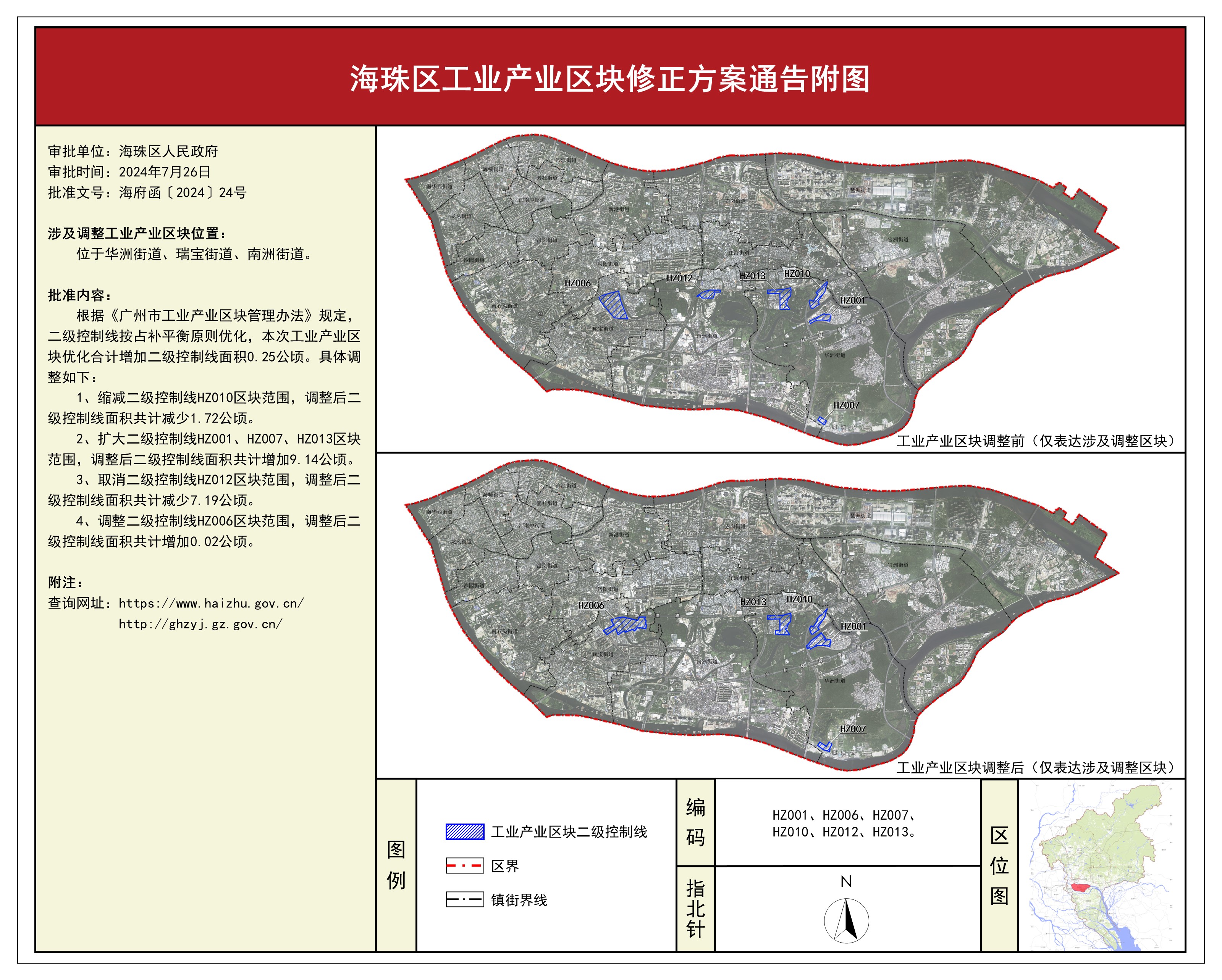 根据《广州市工业产业区块管理办法》(下称《管理办法》),我区组织编制了《海珠区工业产业区块修正方案》, 该修正方案经广州市海珠区城市规划领导小组会议审议通过后获广州市海珠区人民政府批准(海府函〔2024〕24号),自批准之日(2024年7月26日)起生效。