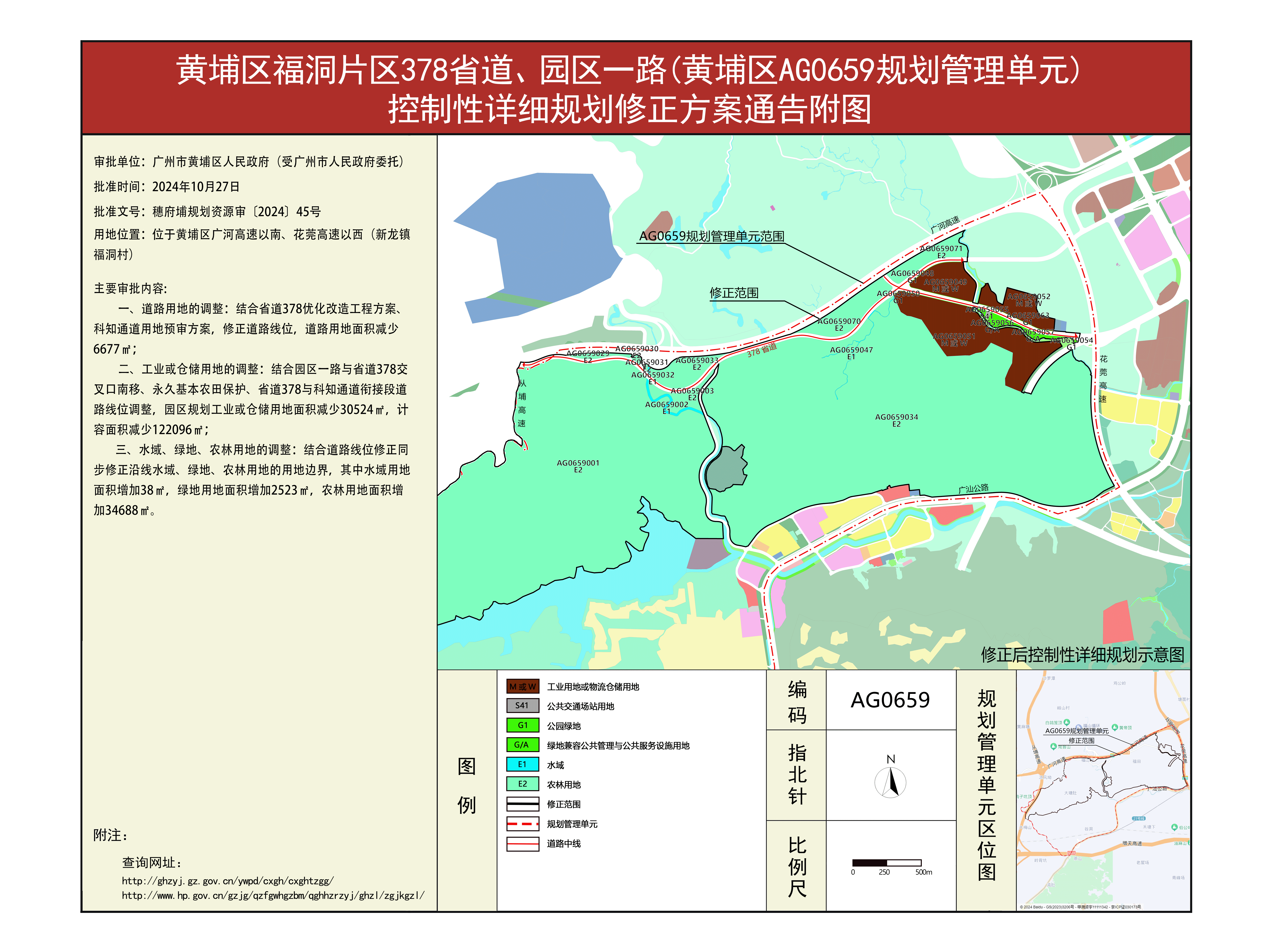 根据《广东省城市控制性详细规划管理条例》《广州市人民政府关于将一批市级行政职权事项继续委托区实施的决定》(穗 府[2019]8号),《黄埔区福洞片区378省道、园区一路(黄埔区AG0659规划管理单元)控制性详细规划修正方案》规划成果已完成规划技术审查、批前公示等程序,获广州市人民政府批准(穗府埔规划资源审〔2024〕45号),自批准之日(2024年10月27日)起生效。
