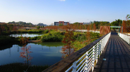 同时,湿地应用低维护成本的岭南乡土植物,在勾勒出野花烂漫,水草繁茂的景致的同时强化去除污染、净化水质的功能,彰显城市低碳景观。